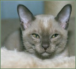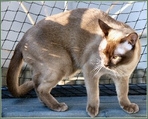 | Unser kleines, verrücktes, unerschrockenes Kerlchen hat sich mittlerweile zu einem ausgemachten ungestümen "Kerl" :-) entwickelt...immer noch hält er die "Mädels" auf trab, oder schlägt sich den Bauch voll. Er ist sehr anhänglich, verschmust und neugierig, - aber welche Burma ist das nicht? Kaum ein Gang ist ohne ihn noch möglich, ob beim Zähneputzen, beim Wäsche aufhängen oder sogar....:-)....er will immer auf der Schulter sitzen, oder zumindest "bei Fuß"....